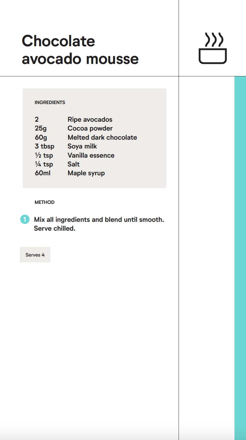 Avocados: Rich in heart-healthy monounsaturated fats and fibre, avocados make this dessert creamy and filling.1