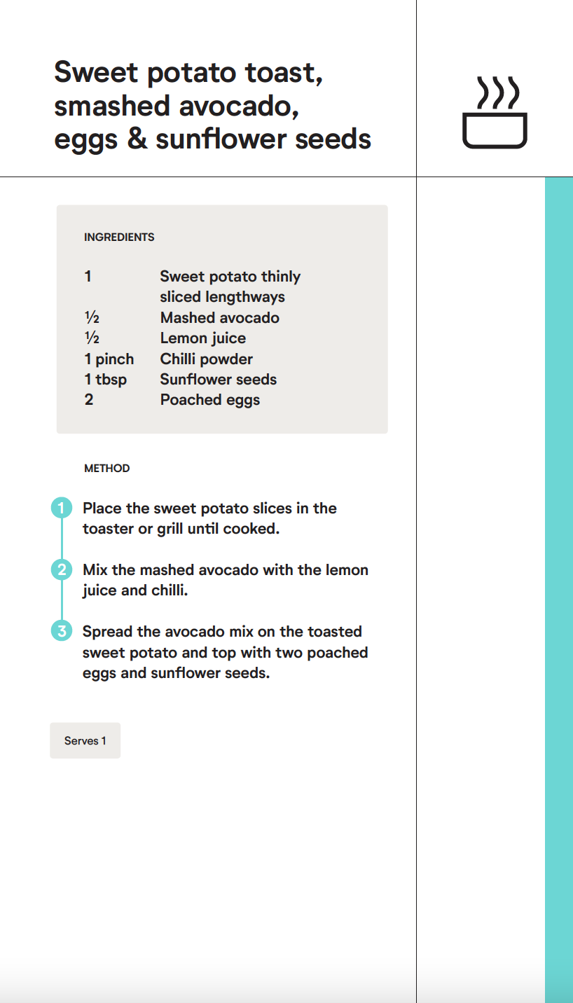 By swapping out bread for sweet potato, you’re not only cutting calories but also increasing your intake of fibre and essential nutrients. Plus, the avocado and eggs deliver a satisfying combo of healthy fats and protein to keep hunger at bay.
